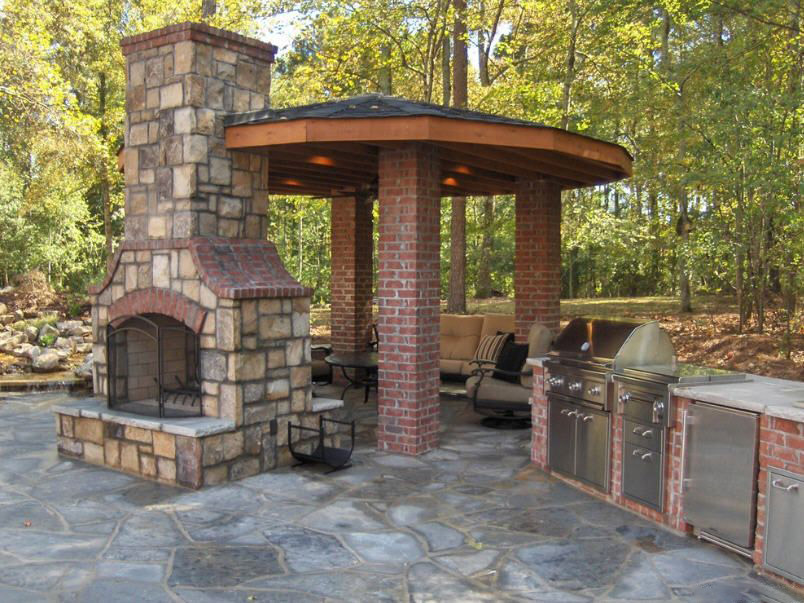 Un bel et spacieux gazebo sera un excellent ajout au foyer extérieur, qui peut être installé à l'intérieur ou à côté du gazebo. Dans le premier cas, le belvédère devrait être assez spacieux, de sorte qu’il y ait une place pour la cheminée et le coin salon avec une table et des chaises. Dans tous les cas, votre espace de loisirs en plein air doit être aussi spacieux que possible pour que vous puissiez inviter de nombreux invités à votre barbecue.