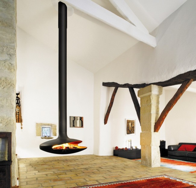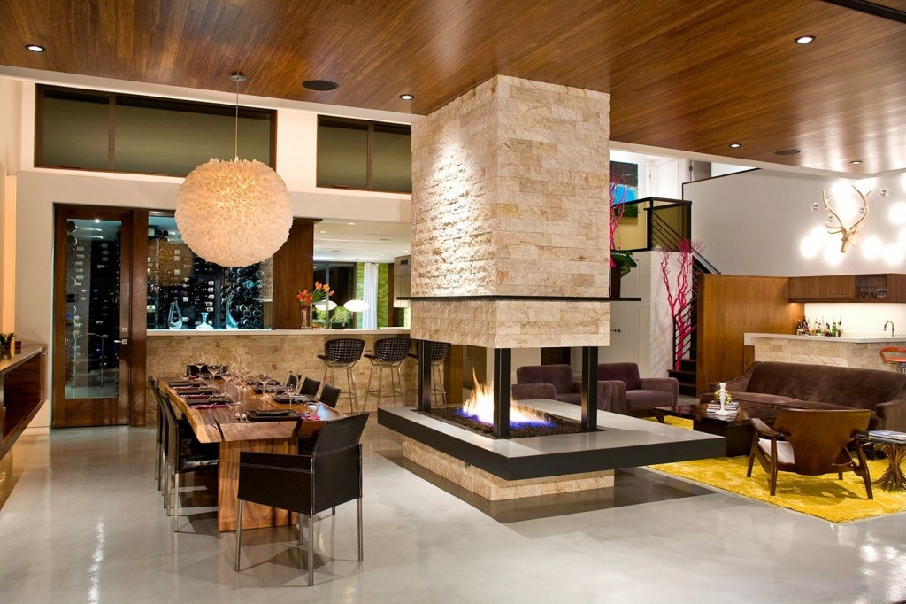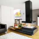 Pour des espaces plus spacieux, des poêles muraux appropriés, installés le long des murs des pièces et de l'île, sont situés dans la zone centrale de la pièce. La cheminée de l’île peut devenir l’accent principal autour duquel le futur intérieur sera formé plus tard. Il peut diviser des zones fonctionnelles dans un studio. À côté des cheminées murales et des foyers d'îlot, situés dans des pièces spacieuses - halls, salons, il est possible de loger harmonieusement un coin salon confortable avec des fauteuils, des canapés et une table basse.