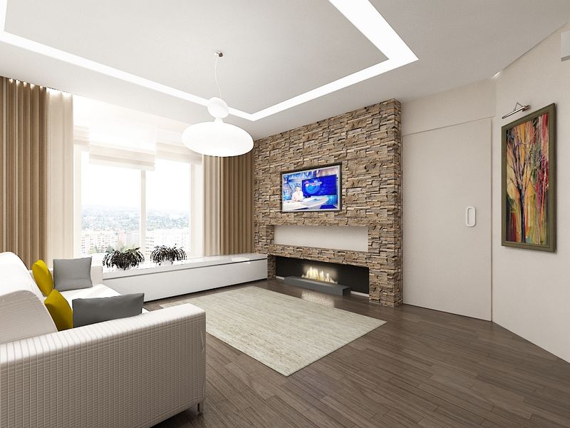Il n’est pas difficile de placer un foyer mural dans une petite pièce - un appareil avec un mince corps en métal, du MDF, du plastique ou du verre, ressemblant à un écran plasma accroché au mur et simulant le processus de combustion.