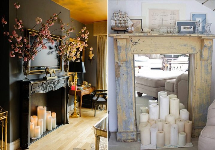 Pour former visuellement le four, utilisez un miroir. Une fausse cheminée est un portail sur lequel les concepteurs placent souvent des vases, des bougeoirs, des figurines et d'autres éléments décoratifs.