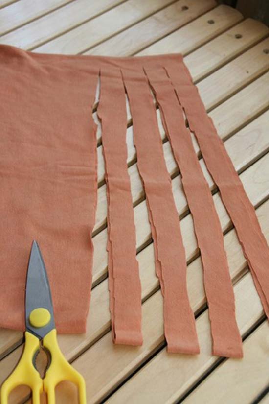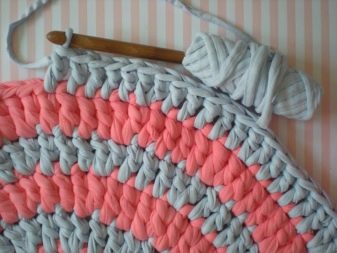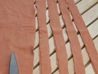 Pour ce faire, utilisez des objets tricotés inutiles (chemises, vestes, t-shirts). Ils sont coupés en lanières pour qu'ils soient aussi longs que possible. Largeur choisir eux-mêmes. Ensuite, ils doivent s’étirer pour que les bords soient enveloppés et se révèlent être des liasses..
