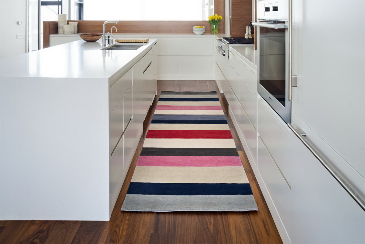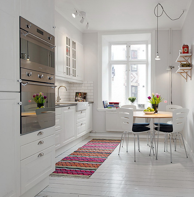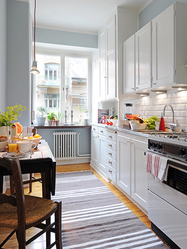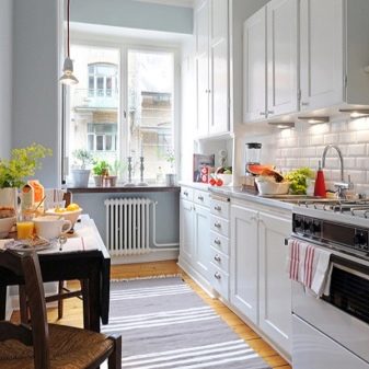 Un tapis intéressant en Provence, placé à l'intérieur d'une cuisine ordinaire et moderne. Il lui confère de la tendresse et de la légèreté, et même si, au premier abord, cela n’attire pas l’attention, c’est un élément important, un détail qui donne de l’espace au confort. Remarquez à quel point c'est doux - c'est sûr qu'il est très agréable de marcher dessus.