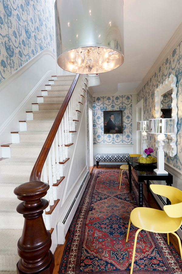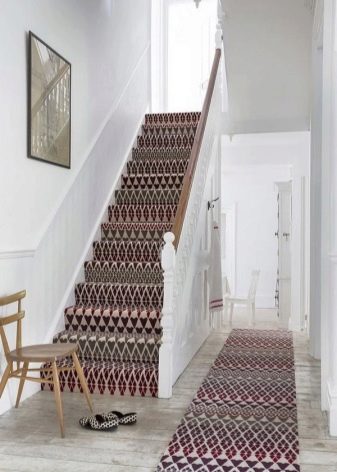 Dans ce cas, le tapis accentue le couloir. Et il est très compétent que l'accent soit mis ici sur un tapis, pas sur des murs ni sur des meubles chargés de murs.L'impression décharge visuellement l'espace, lui donne de la légèreté et malgré la teinte peu assourdie, l'intérieur devient immédiatement vivant.