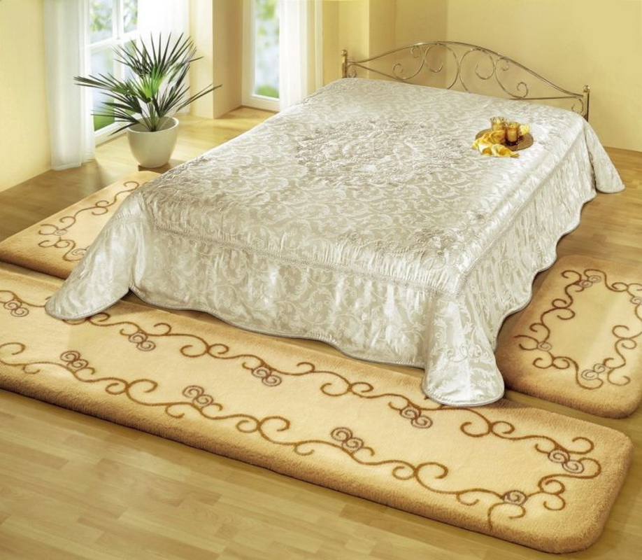 Voici un excellent moyen d'utiliser un tapis dans la chambre à coucher. Puisque les jambes près du lit sont lourdes, qu’elles ont un tapis à part entière à la place des rails, qui occupent l’espace sous le lit, il y aurait sûrement des traces dessus, ce qui entraînerait son remplacement rapide. Cependant, cette situation ne se produira pas si vous utilisez plusieurs pistes (trois comme ici) et que vous les chevauchez avec un lit autour du périmètre. Et ça a l'air super, et pratique, et de belles jambes.