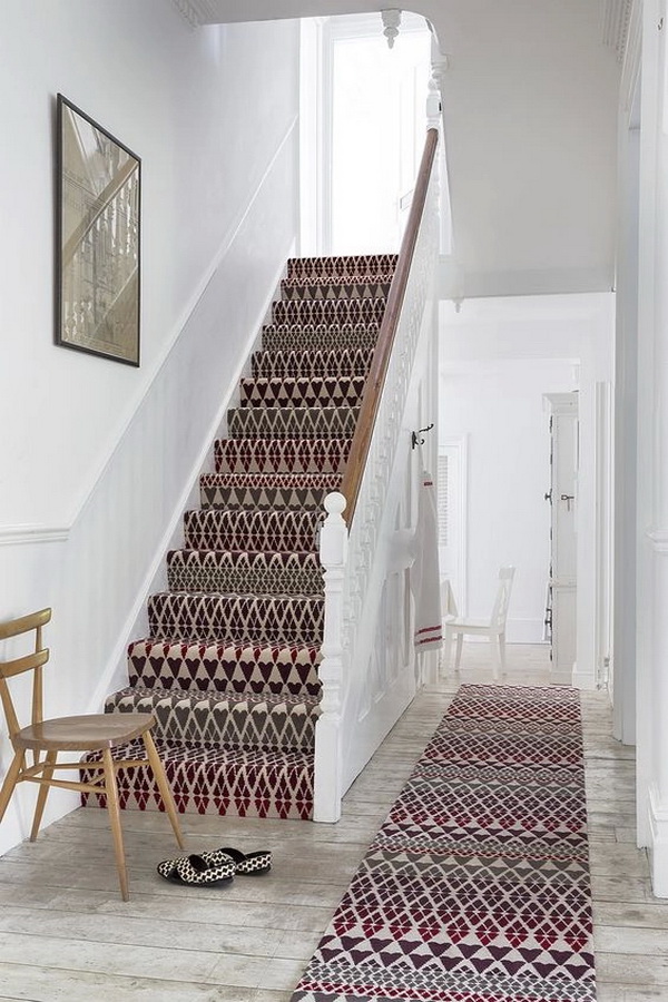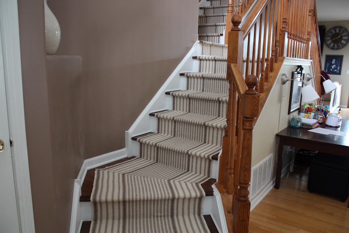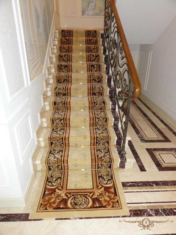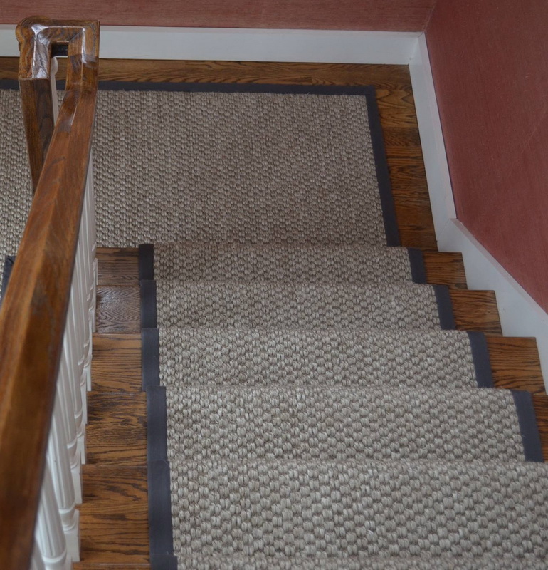 Ceci est un exemple de l'emplacement correct du tapis dans les escaliers. Notez qu'il n'est pas nécessaire que le tapis couvre toute la largeur de l'escalier. Il suffit qu'il ne couvre que le milieu.
