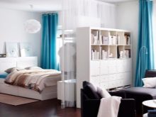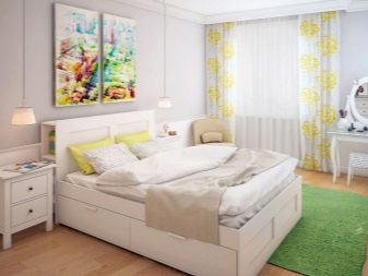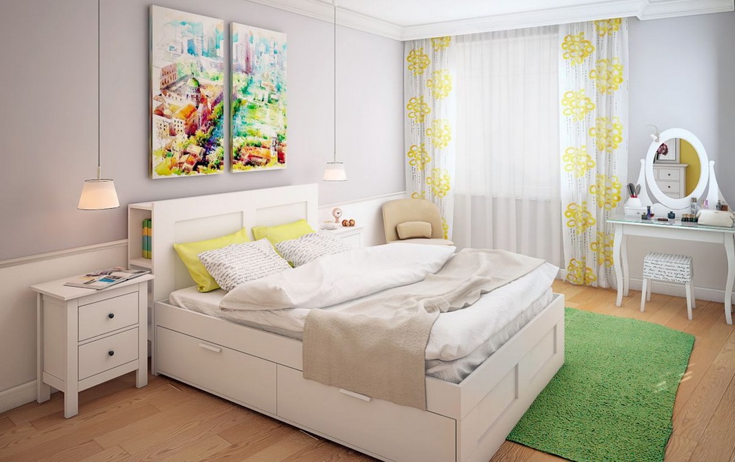 Si la taille de la chambre à coucher est plutôt modeste, il est préférable de privilégier les petits tapis, situés de part et d'autre du lit, ainsi qu'au pied de celui-ci. Ils peuvent être un accent brillant, nuancer l'idée de conception globale et attirer l'attention. Contrairement aux grands spécimens, qui doivent correspondre à la couleur du meuble, ces conditions difficiles ne sont pas mises en avant par le petit tapis de chevet, elles peuvent être fabriquées dans des couleurs contrastées.