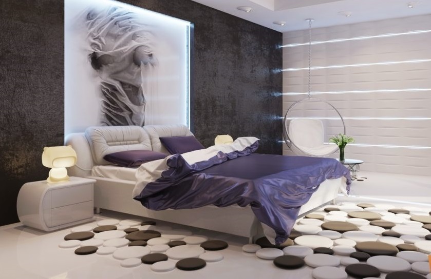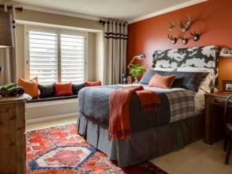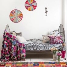Faites attention à l'emplacement du tapis de lit - au mur ou au plafond. Si vous utilisez l'attribut wall pour la chambre à coucher, vous devez tenir compte de la conception des murs. Il est également important qu'un tel accessoire soit combiné avec un lit et des rideaux, car sinon, il se focalisera sur une attention excessive.