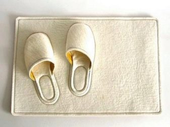 - Avec des pantoufles - Ce modèle inhabituel plaira à ceux qui aiment tout ce qui est original.En apparence, un tel produit n'est pratiquement pas différent du tapis habituel, situé près du lit. Mais il y a des trous spéciaux pour les pantoufles. Les pantoufles sont fabriquées dans le même matériau que le tapis et fusionnent avec ce dernier. Mais, en vous levant le matin et en vous levant, vous vous sentirez parfaitement dans vos pantoufles. Un tel attribut ne sera pas seulement décorer la salle, mais va surprendre vos invités.