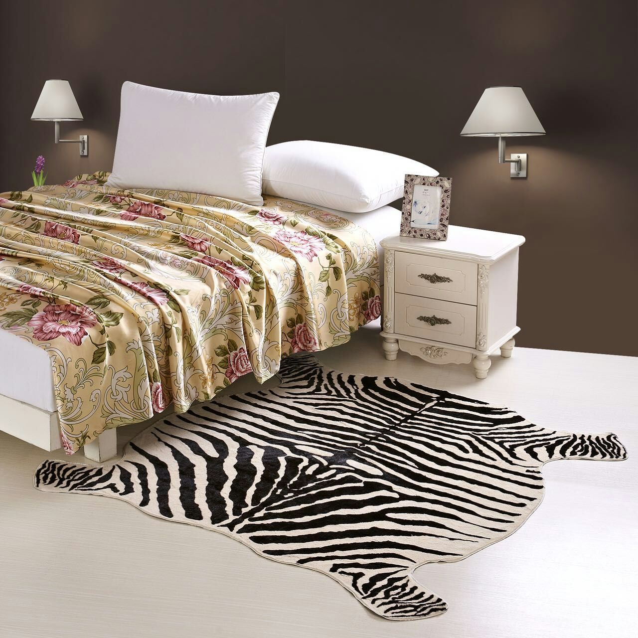 Les tapis sous la forme d'une peau d'un seul animal ou faits de morceaux utilisant la technologie du patchwork conviendront à une chambre à coucher de style ethnique. Les tapis fabriqués en forme de peau de zèbre sont extrêmement populaires auprès des designers. Des produits originaux similaires s'intégreront parfaitement à tous les intérieurs, mais ils seront plus beaux dans une pièce dominée par les couleurs noir et blanc.