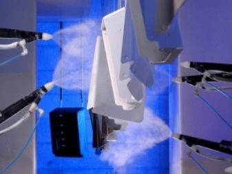Tous les équipements (caméras) disposent d'installations de nettoyage: bunkers, écrans vibrants et outils d'aspiration. Les caméras elles-mêmes sont divisées en deux parties: elles peignent des produits de grande taille et des impasses (elles y peignent de petites choses). La couleur du métal dans les chambres de peinture automatiques est très productive et leur rémunération est donc pleinement justifiée et rationnelle. Dans la plupart des cas, le procédé est électrostatique: une poudre chargée électriquement et pulvérisée dans l'air recouvre la pièce et adhère suffisamment à la surface.