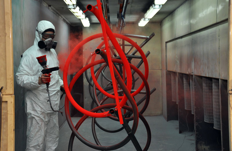 Pour l'application de peinture en poudre, il est également nécessaire de fournir un éclairage correct (avec des lampes fluorescentes) et de veiller à la ventilation de la pièce. Ce n’est que par l’élimination en temps voulu de la plus petite suspension de colorant à l’extérieur et sa neutralisation que vous pourrez être calme pour votre santé. Le travail professionnel comprend également l'utilisation d'échangeurs de chaleur. Remplacez-les dans l'atelier domestique par un groupe cyclone aspirateur.Un appareil ordinaire sera toujours bouché par la saleté en très peu de temps.