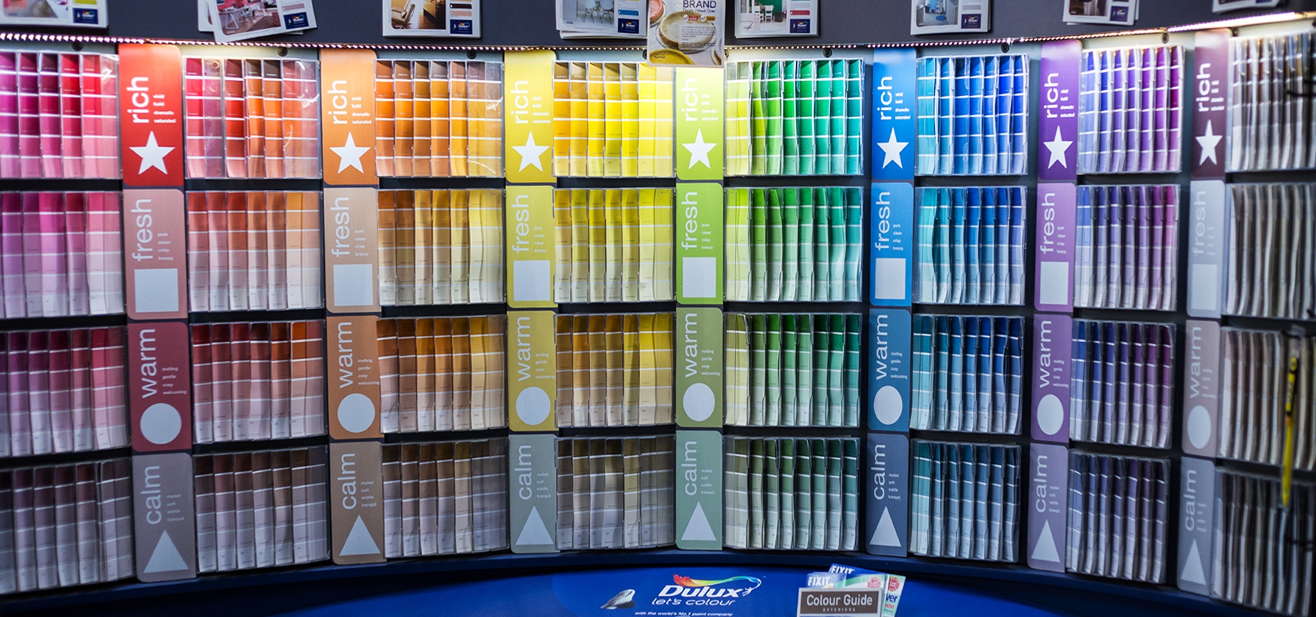 Parmi les compositions uniques de la marque, notons Dulux Trade Vinyl Soft Sheen (appliqué sur le papier peint à peindre), Dulux Light & Space Matt (matériau réfléchissant), Dulux Magic White (avec un indicateur de couleur).