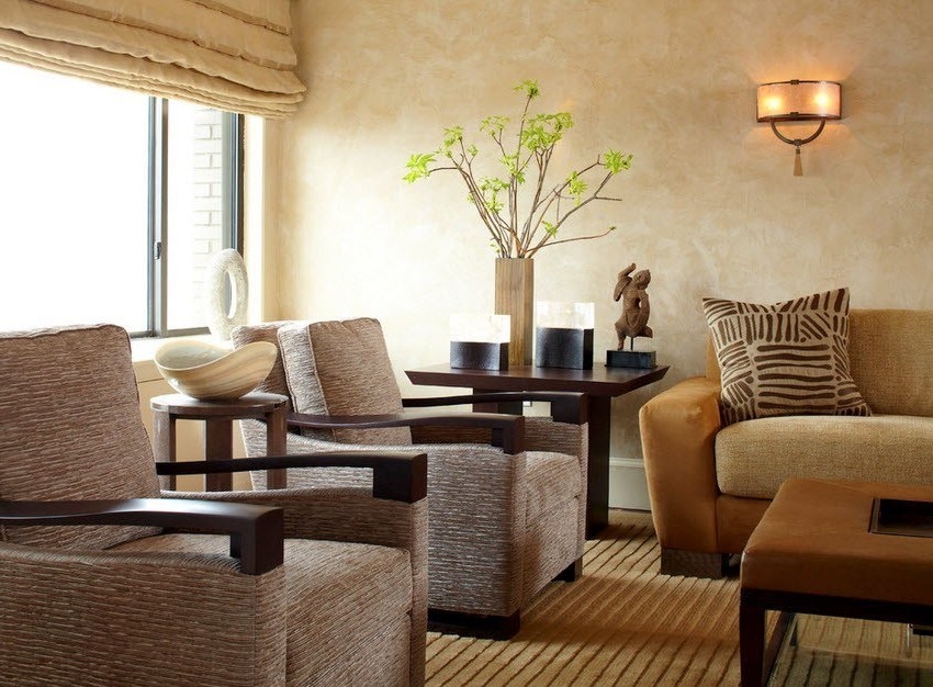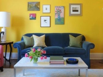 Le salon est souvent fait dans des couleurs colorées, mais tout dépend du type de design choisi précédemment. Les couleurs pastel qui semblent non seulement apaisantes, mais aussi douces et naturelles, sont très populaires. Si vous êtes intéressé par le revêtement de texture, utilisez d'abord un apprêt et d'autres matériaux avec lesquels vous obtenez l'effet désiré. Et seulement après cela, la surface est peinte avec une composition d’émulsion d’eau des couleurs correspondantes.