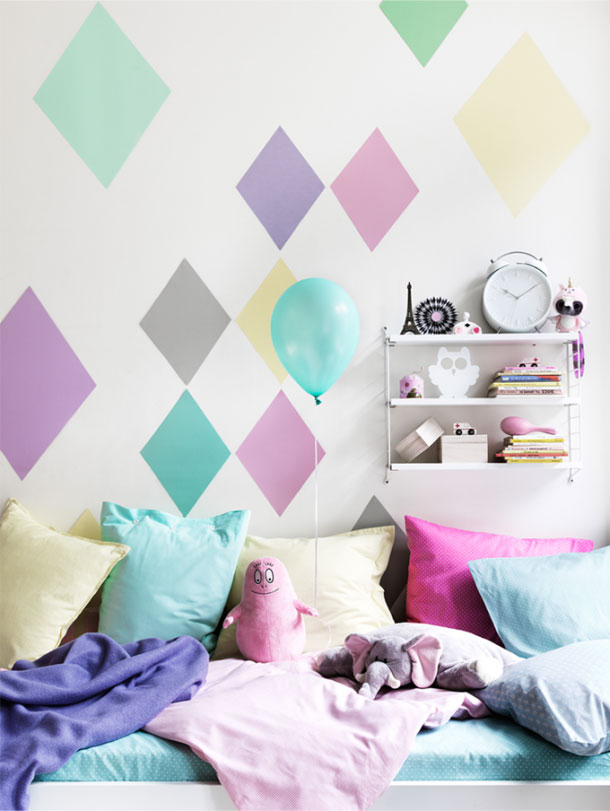 Les murs où plusieurs couleurs sont combinées sont magnifiques, dans ce cas, les concepteurs ont recours à un dessin géométrique de la surface.
