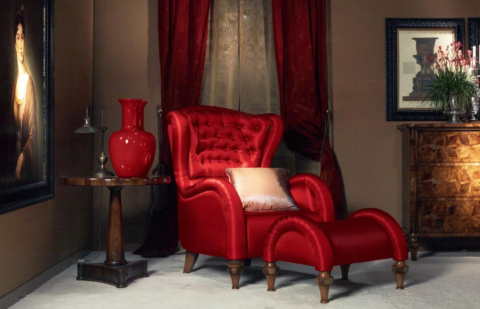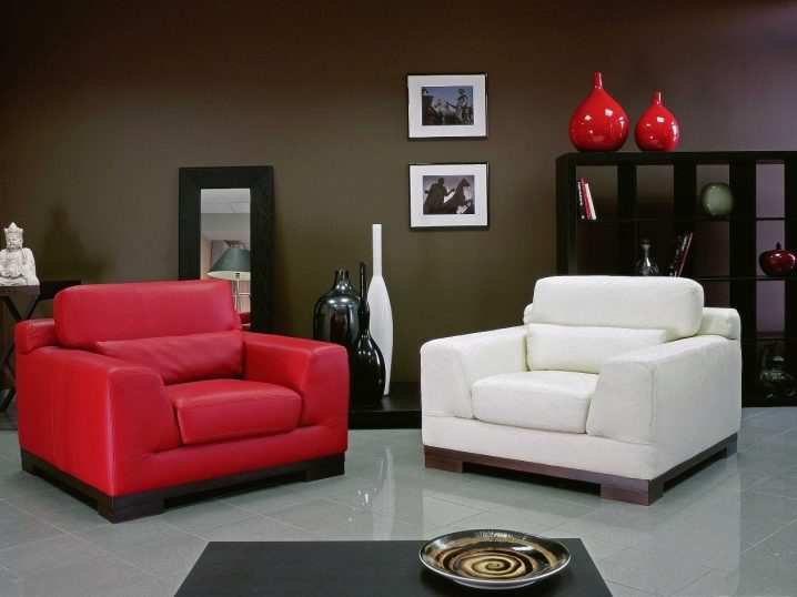 Pour atténuer la luminosité de votre fauteuil écarlate ou bordeaux, vous pouvez choisir un réglage similaire, mais dans une couleur plus sobre. Par exemple, blanc, beige ou marron. Ainsi, la couleur brillante semblera moins accrocheuse et la lumière un peu plus vivante.