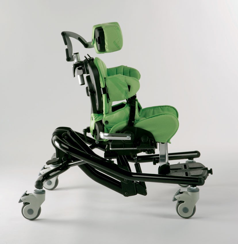 Des chaises orthopédiques de fabrication allemande pour enfants «spéciaux» peuvent facilement être montées sur le châssis de la poussette, ce qui est très pratique.