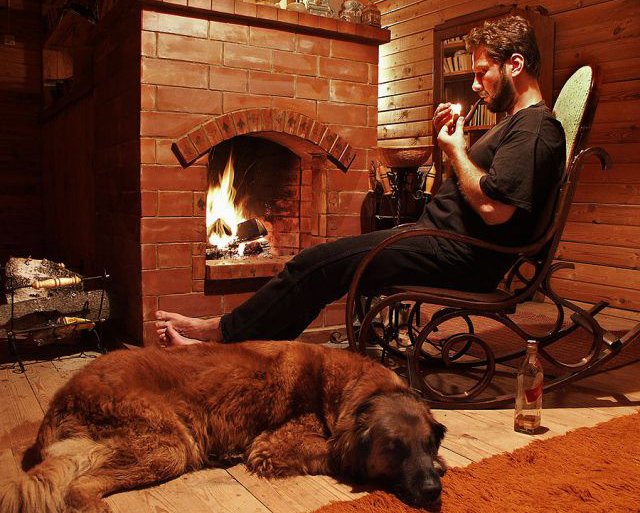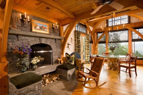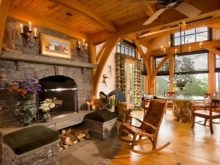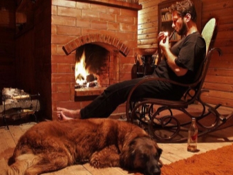 - Une vraie cheminée et fauteuil à bascule en cuir, recouvert de cuir, une combinaison sûre. Ce meuble est en accord avec le design de toute la pièce, où seuls des matériaux naturels comme le bois, la pierre et des couleurs chaudes sont utilisés.