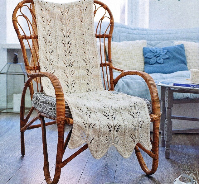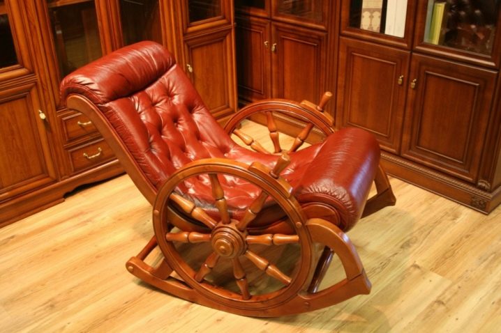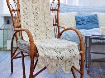 Rembourrage en cuir ou cuir écologique fière allure à l'intérieur. Ils ne conviennent pas à la rue, car ils doivent être traités avec soin et se détériorent sous l'effet de l'humidité ou du soleil excessif. Les artisans peuvent faire pour eux-mêmes couverture tricotée sur la chaise. Il a l'air confortable et réchauffe. Les fauteuils à bascule, «habillés» dans un tel matériau, peuvent s’intégrer à la fois dans l’appartement en ville et dans l’intérieur de la villa ou de la maison de campagne.