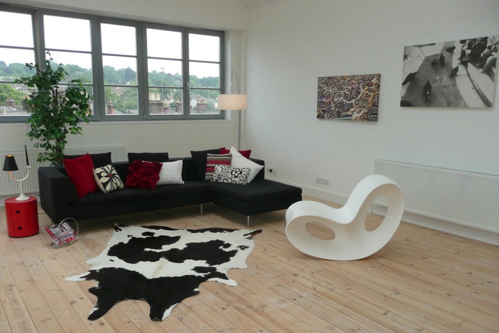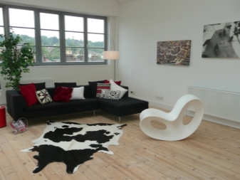 - Fauteuil à bascule en plastique inhabituel qui attire instantanément le regard. Un modèle fantaisiste ne permet pas de deviner immédiatement le but de ce meuble. Fabriqué en blanc, comme le reste de la pièce, il réussit tout de même à devenir un accent brillant dans la conception du salon. Malgré le fait qu'il soit en plastique, la chaise est durable en raison de sa forme.Cependant, le matériau léger le rend très mobile et vous permet de le réorganiser de pièce en pièce. Il peut être laissé en toute sécurité sur la terrasse ou le balcon, car il ne craint pas les intempéries.