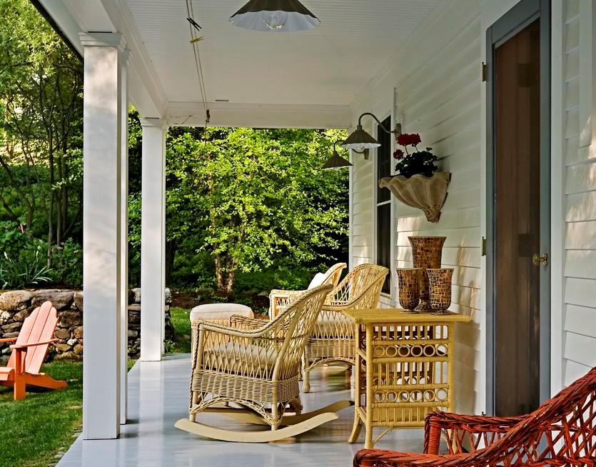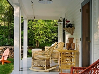 - Très souvent, l'intérieur manque un peu pour devenir vraiment à l'aise. Dans ce cas, le porche de la maison a été décoré avec des chaises à bascule de différentes couleurs tissées à partir d'une vigne. Ils sont combinés dans la couleur et la structure du tissage avec le reste des meubles de jardin. Sur une telle terrasse, il est bon de se détendre par une chaude journée d’été ou de passer des soirées tranquilles en s’enroulant dans une couverture et en écoutant le chant des grillons.