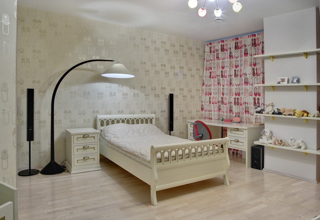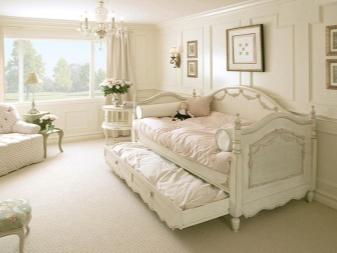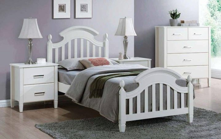 Lit simple blanc - une vraie trouvaille pour n'importe quelle piècequi s'intégrera harmonieusement dans le design et «diluera» la gamme de couleurs choisie. Un tel intérieur se mariera parfaitement avec les plafonds et les murs de couleur rose pâle, bleu ou crème.
