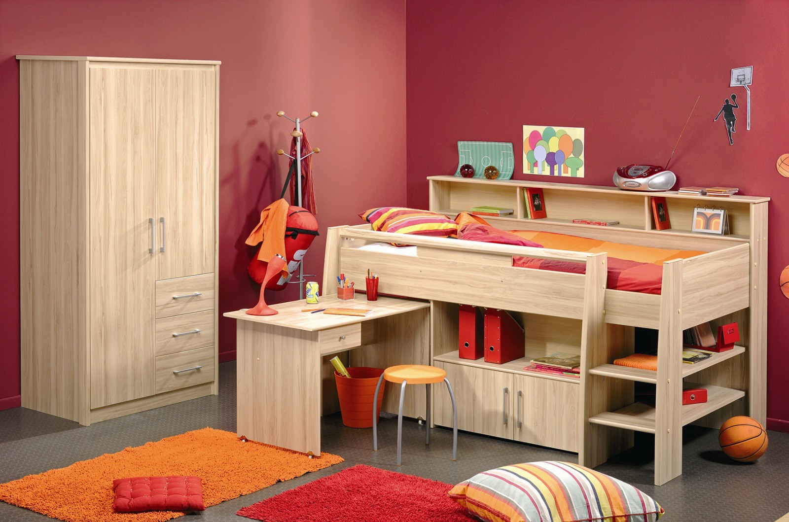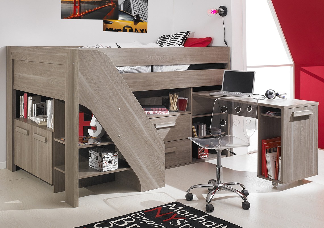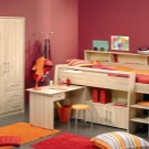 - Multicomposant. Ce type de mobilier de chambre combine le lit avec des étagères, une armoire, des tables de chevet, des tables et d’autres objets. Le lieu de repos est situé sur le niveau supérieur et n'est pas toujours destiné à deux enfants.Ce mobilier avec marches ou marches menant au niveau supérieur aidera les parents à organiser un véritable coin pour enfants pour un enfant.