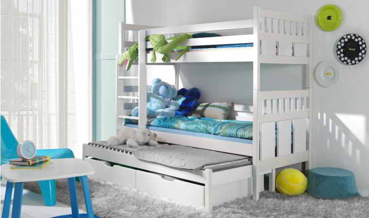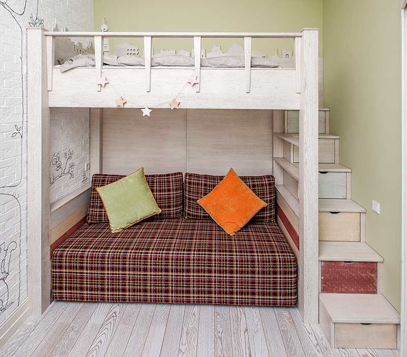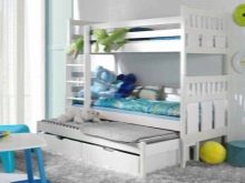 - Rétractable. Le lit a deux niveaux et deux couchettes, mais le lit inférieur est mobile et se cache sous le lit supérieur pendant la journée. Les côtés de ce modèle peuvent être en forme de "vagues", rectangulaires avec un motif en forme d’animaux, etc. Le premier étage peut être équipé de deux ou trois tiroirs pour ranger les choses nécessaires.