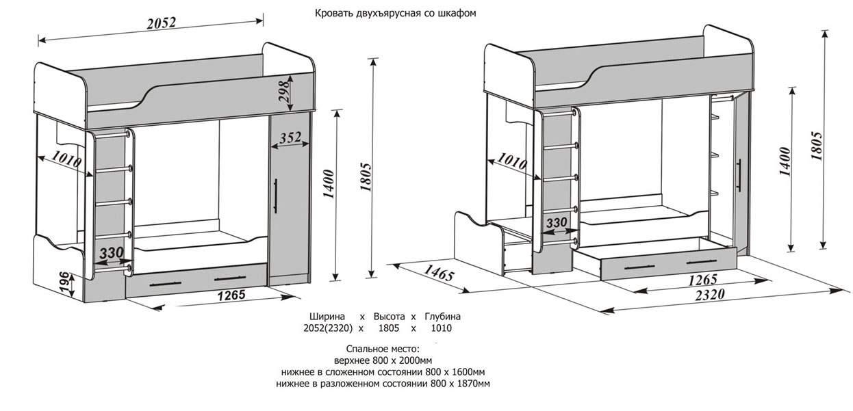 Les dimensions extérieures du produit dépendent entièrement de son modèle et peuvent être très différentes. Paramètres standard (LH) - 200x80 / 90 cm Certains modèles proposent un lit à l'étage supérieur avec des dimensions standard et un étage inférieur - avec une largeur deux fois plus grande (jusqu'à deux mètres). Lors du choix d'un lit superposé, il est nécessaire de déterminer avec précision les dimensions nécessaires de la chambre à coucher pour éliminer l'inconfort des enfants.