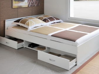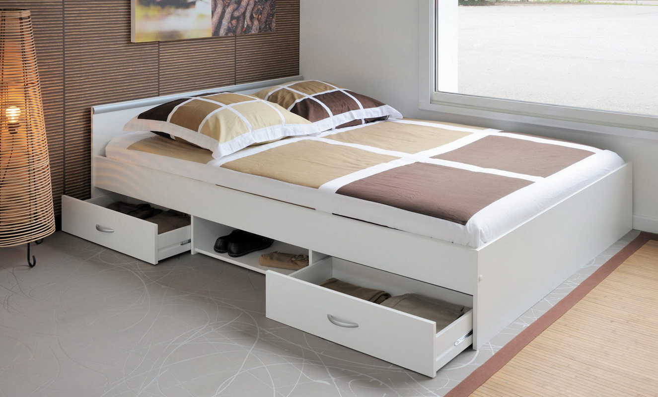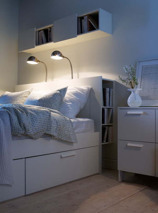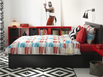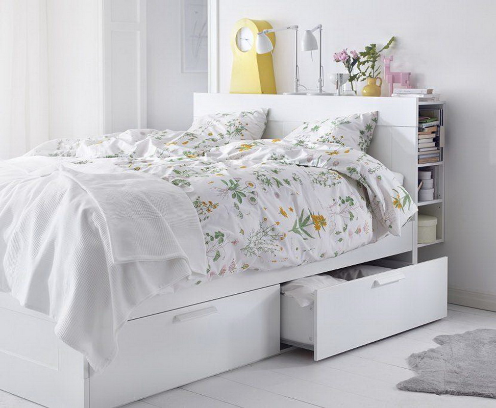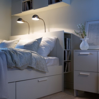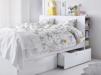 Un autre lit - Brimnes a 4 boîtes coulissantes et spacieuses. Il ne possède pas de tête et de pied de lit hauts et ressemble plutôt à une boîte avec une base orthopédique et un système de stockage. Vous pouvez acheter une tête de lit fonctionnelle avec des étagères qui vous soulagera des tables de chevet ennuyeuses et créera un petit espace pour les choses nécessaires que vous pourrez utiliser avant d'aller vous coucher: des verres, un livre, une tasse de thé ou autre chose.