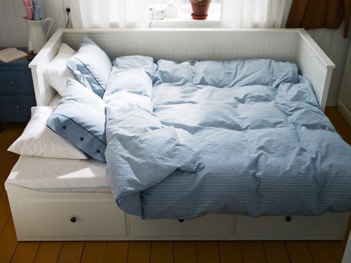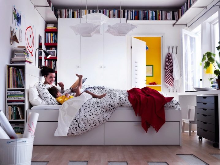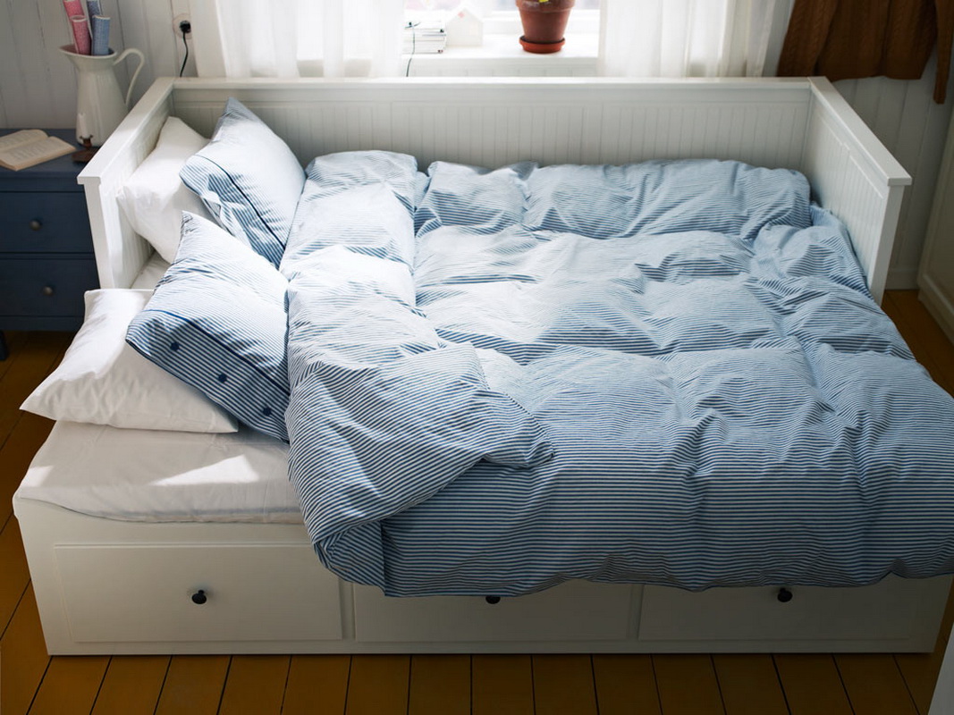 Un autre truc d'Ikea est divans-lits avec lit gigogne, qui est facilement avancé lorsque cela est nécessaire et n’interfère pas du tout dans la vie quotidienne. Un lit escamotable avec un matelas supplémentaire est utile pour la chambre d’un enfant, surtout si celui-ci a souvent des amis la nuit.