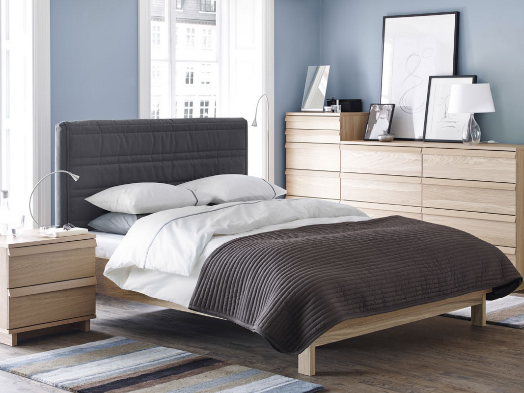 Ces lits ont l’air chaleureux à l’intérieur de la chambre et dans Ikea est un modèle Oppland. Son cadre est en aggloméré de bois et recouvert de placage de frêne (foncé, presque noir) ou de chêne (clair), ce qui confère à la boîte élégance et coût élevé. La tête de lit haute (122 cm) est entièrement réalisée en contreplaqué, elle est dotée d'une couche douce (laine de polyester) et d'un revêtement en tissu d'un ton bleu profond et foncé.