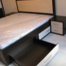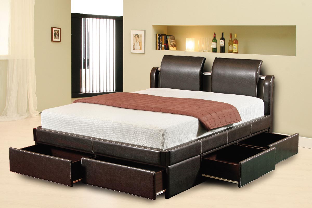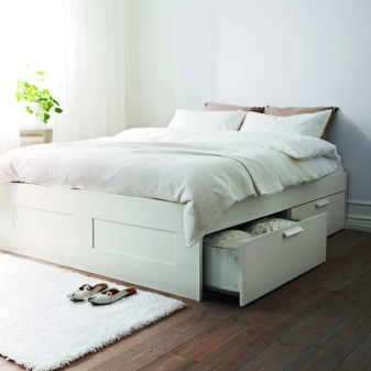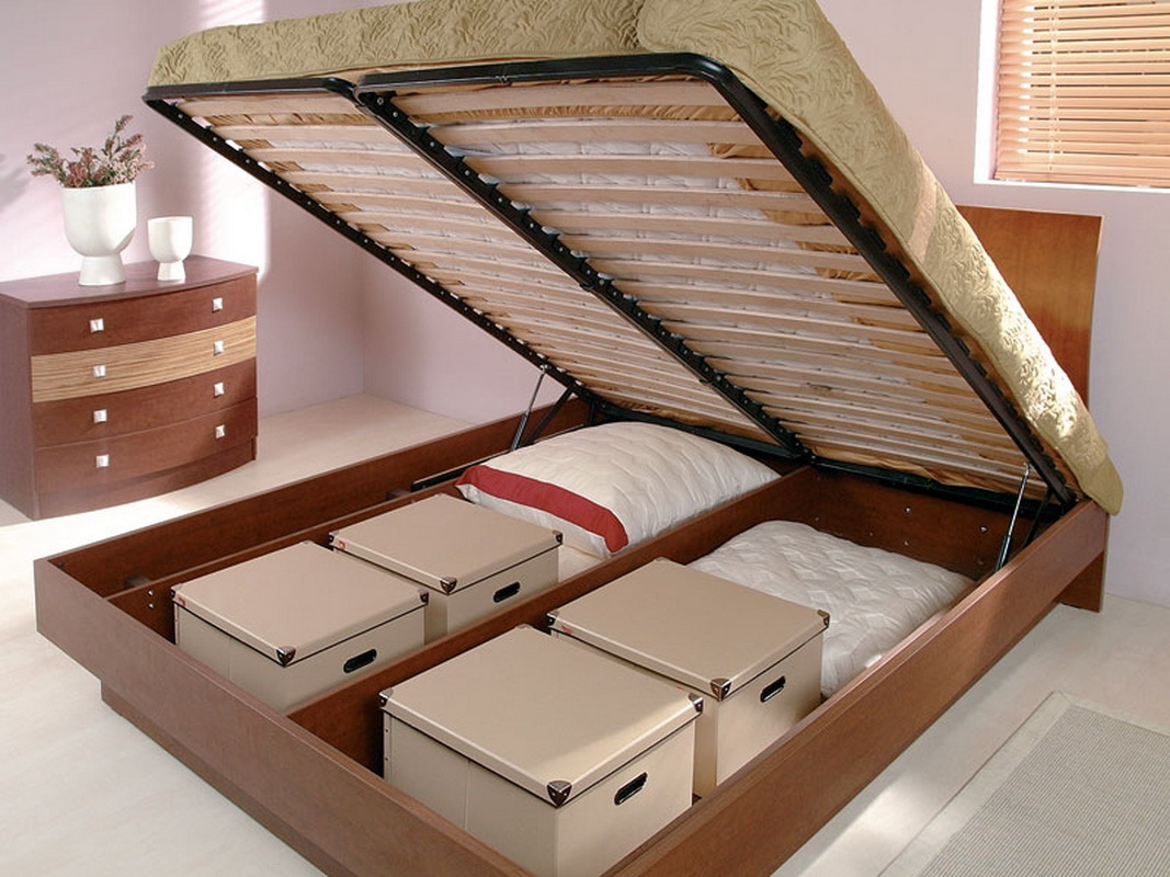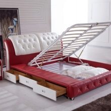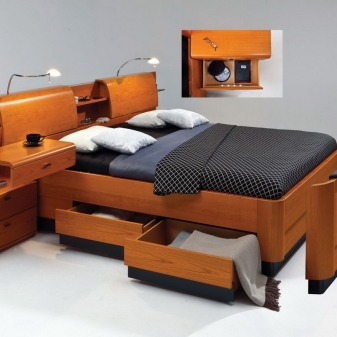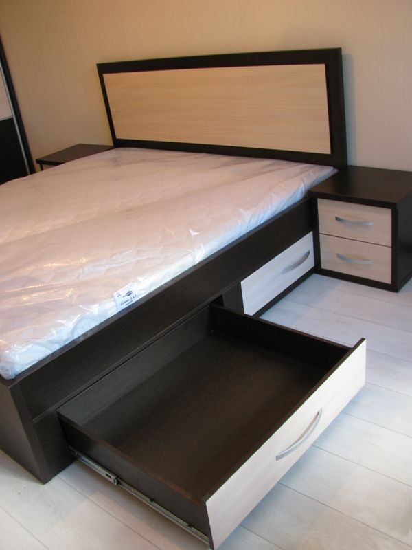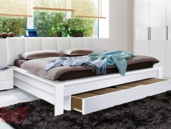 - Pour ceux qui ont une petite chambre, correspondra à l'option avec 2-3 guides. Après tout, déployer les boîtes nécessite un espace supplémentaire. Si vous choisissez de tels meubles, sachez que les tiroirs se situent en bas et forment un tout avec le lit lui-même. Ainsi, les modèles avec boîtes intégrées présenteront un inconvénient en termes de transport du produit. Ce ne sera pas toujours pratique et l'accès aux choses. Vous devez constamment lever ou baisser le haut du lit.