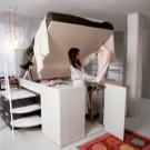 - Il convient de choisir un mécanisme de levage sur les amortisseurs à gaz. Dans ce mode de réalisation, la montée est assez facile et confortable, et le design est durable. Il convient de noter que ces lits seront coûteux. Mais ça en vaut la peine. Les options de printemps seront moins chères, alors qu'elles s'usent rapidement, et vous devrez faire plus d'efforts pour relever le lit.