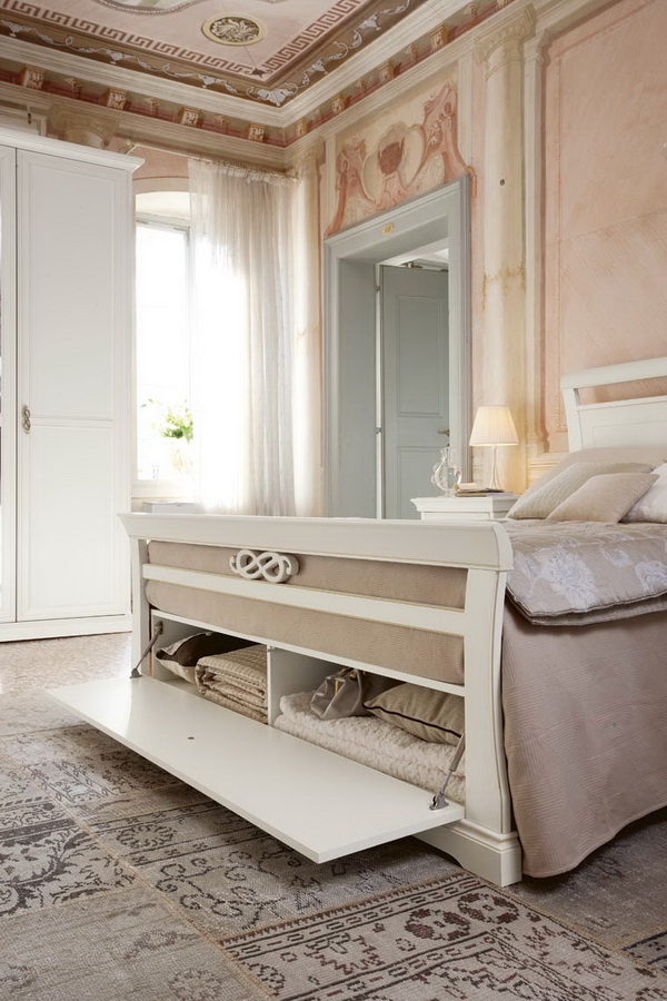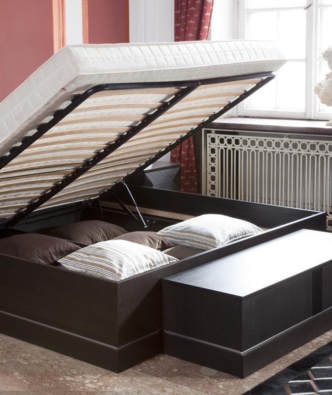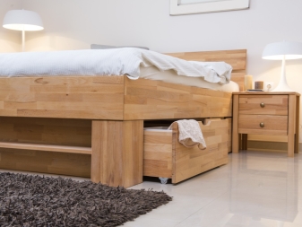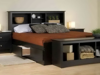 - Variations variées de boîtes. Les modèles peuvent avoir différents composants. Celles-ci peuvent être de grandes ou de petites boîtes pour stocker divers articles. Il est à noter que les grandes options augmenteront la hauteur du lit. Certains modèles ne peuvent être gravés qu’en utilisant un banc. En même temps, ils seront assez spacieux. Là, vous pouvez stocker des draps, des textiles. Vous n'aurez pas besoin d'acheter une commode pour cela.