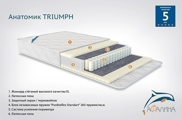 La société fabrique des matelas de différentes catégories de prix à partir de matériaux de remplissage certifiés et de haute qualité, ainsi que de produits pour le printemps sans ressort et classiques. Le produit à ressort doit obligatoirement être équipé de blocs indépendants, sinon il n'aura pas de caractéristiques orthopédiques. L'usine "Afalina" utilise un bloc dans lequel chaque ressort est placé dans un boîtier indépendant qui assure la répartition de la charge.