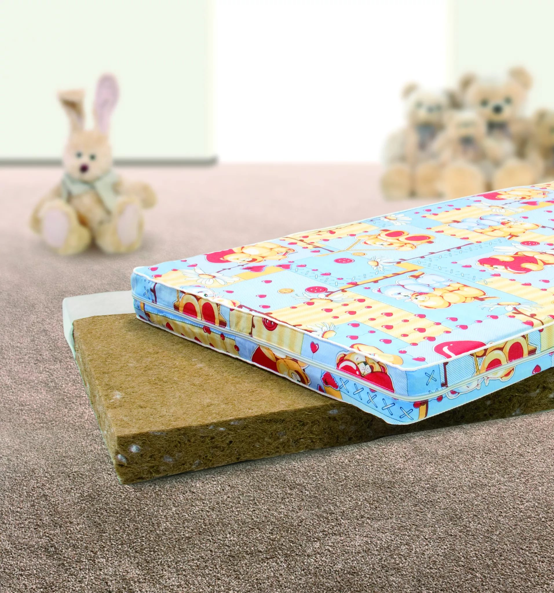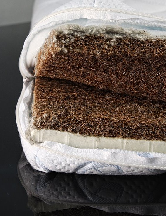 - Tissu de coco (coco) - des couches de fibres imprégnées de latex. Ces produits se caractérisent par une rigidité accrue et tout dépend de l'épaisseur de la couche de fibre de coco. Il est intéressant de noter que la fibre de coco est également utilisée pour réguler la rigidité et dans les matelas à ressorts. Si seules des portions de noix de coco étaient utilisées pour la fabriquer, sa rigidité n'était pas inférieure, même au béton. Un matelas en fibre de coco de coco sera une option idéale pour les enfants jusqu'à 3 ans, car c'est à cet âge que la rigidité est nécessaire pour former une posture correcte, elle devra ensuite être changée.