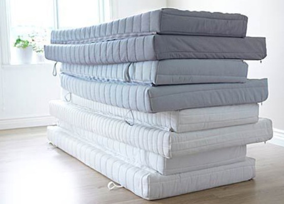 - Futon - matelas composites à base de mousse de polyuréthane avec différents additifs (polyester, coton, fibres d'ortie) et effet antistress, plan unilatéral et bilatéral plus ou moins rigides.