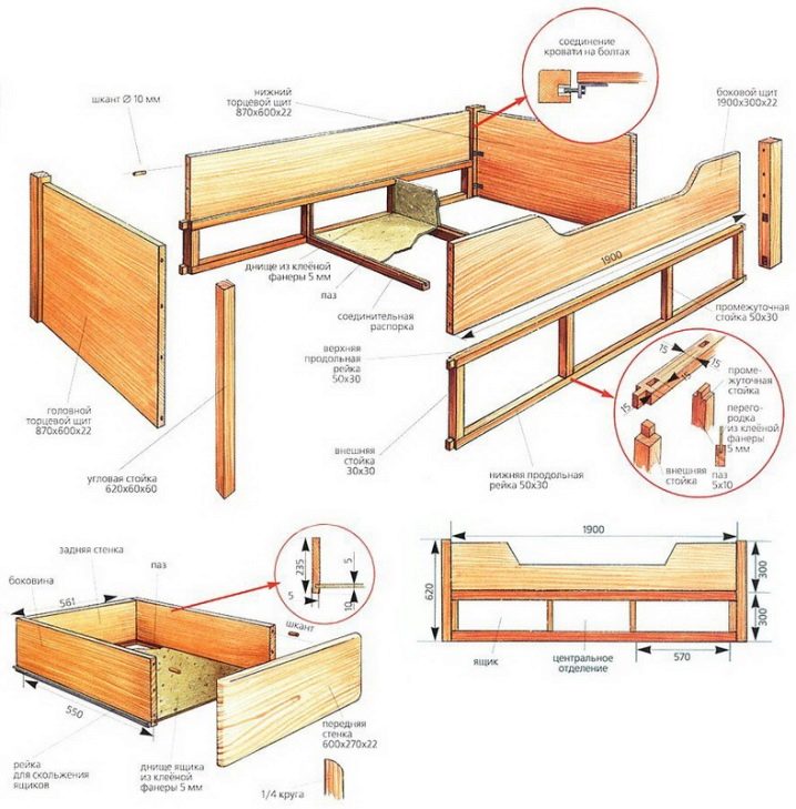 Si la largeur de votre lit est supérieure à 130 cm, il est préférable de le renforcer avec une poutre longitudinale au centre de la structure. Si vous montez un lit pour un enfant, vous devez également placer un côté sur celui-ci, qui remplira une fonction de protection. Ce dossier peut être vissé à la fois lors du montage du cadre et sur le lit déjà fini. N'oubliez pas que le lit à côtés doit être installé dans un coin de la pièce. Il est donc préférable de prévoir au moment de la conception s'il y aura un buffet «loft» pour enfants.