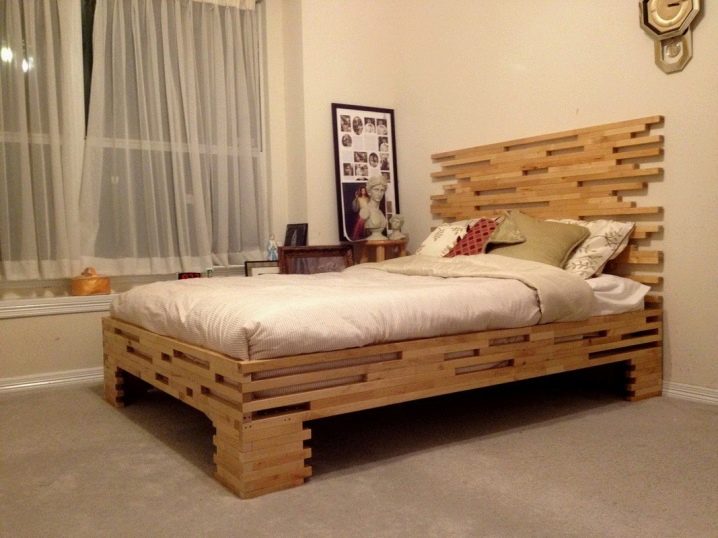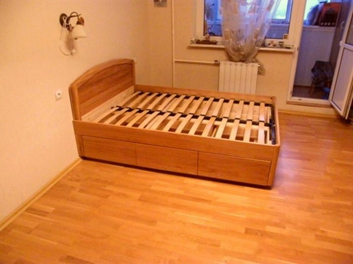 Au début, il vous suffit de créer une boîte rectangulaire, fixant tous les composants du cadre avec des vis. Ensuite, vous devez vérifier si tous les coins sont bien joints. Après cela, vous devez les renforcer avec des coins métalliques. Après cela, tout le périmètre du cadre de l'intérieur, vous devez fixer les barres, et sur elles les lattes de bois sur lesquelles vous continuerez à poser le matelas. La distance entre les lattes devrait être d'environ 3 cm Si vous souhaitez décorer le lit à sa base de quelque manière que ce soit, vous devez le décorer à ce stade.