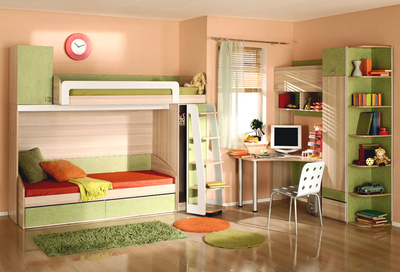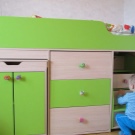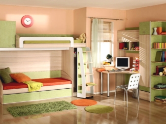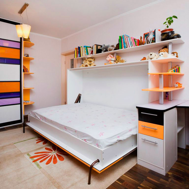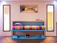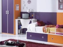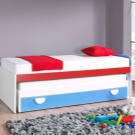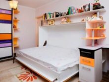 Lors du choix d'un modèle pour un enfant, son sexe doit être pris en compte. Par exemple, pour les écoliers, il vaut la peine de préférer transformer les modèles avec un endroit où s’asseoir. Faites attention et un grand nombre d'étagères, où la jeune fashionista va plier ses vêtements. Il est nécessaire de choisir des tons doux de meubles - beige, les nuances de pêche vont approcher. S'il s'agit d'un lit pour garçons, il vaut mieux rester sur les couleurs bleu, vert et gris.