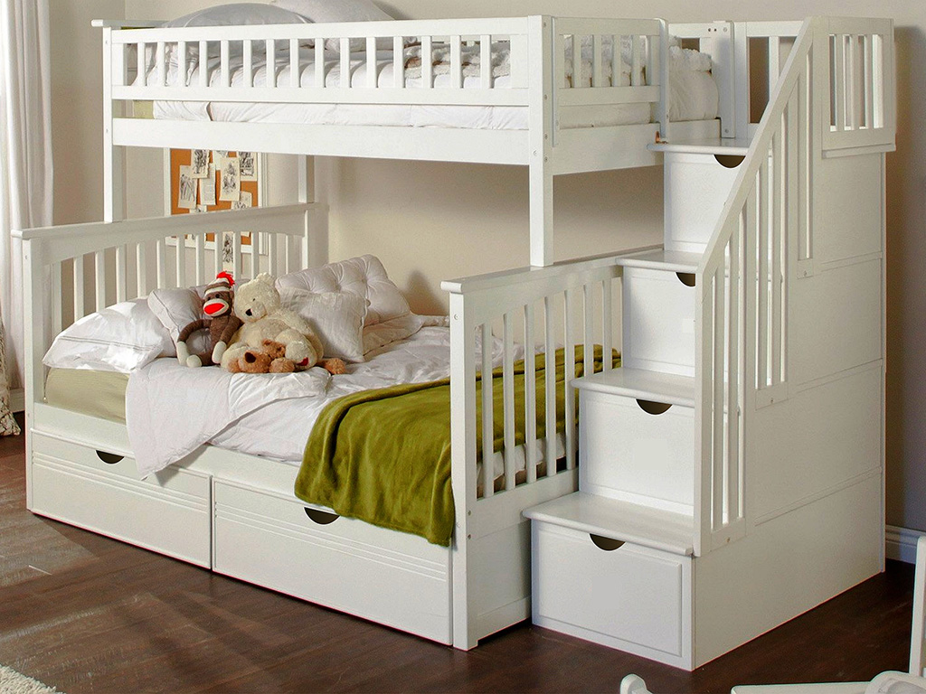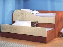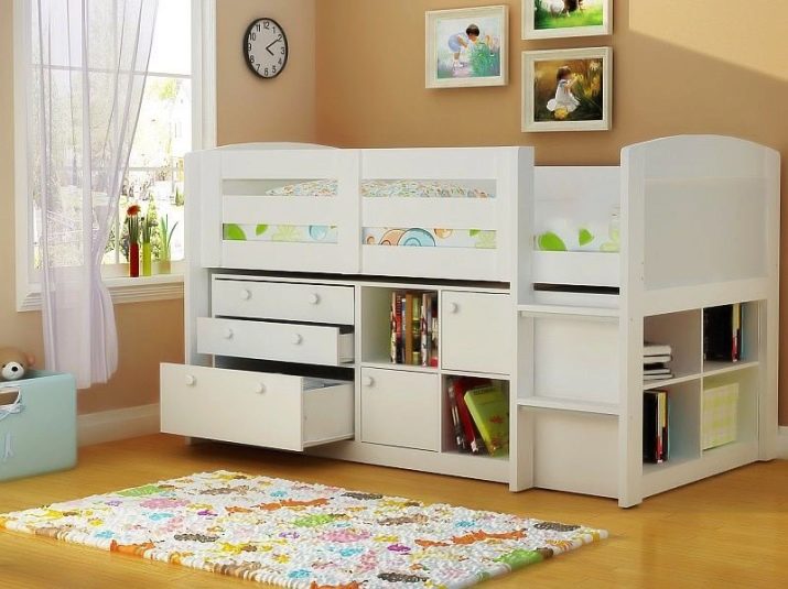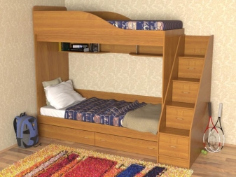 - Couchette Ce modèle sera confortable pour plusieurs enfants. Dans les tiroirs fonctionnels, vous pouvez mettre du linge de lit, ainsi que d'autres objets et objets. Cette conception prendra peu de place dans la pépinière. Cela permettra d'économiser de l'espace.