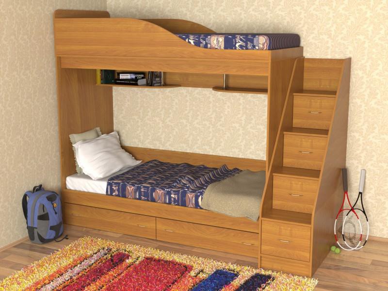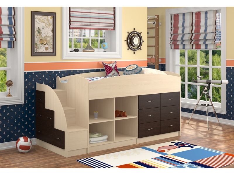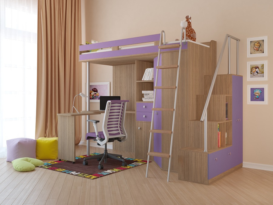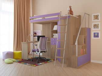 - Lit mezzanine. Cette option est également courante sur le marché du meuble. Le produit prend peu de place et est en même temps très fonctionnel. Il existe des options non seulement avec une commode, mais aussi avec une table pour la formation. Dans les tiroirs, vous pouvez mettre tous les éléments nécessaires pour vous.Montez sur le lit en utilisant les marches.
