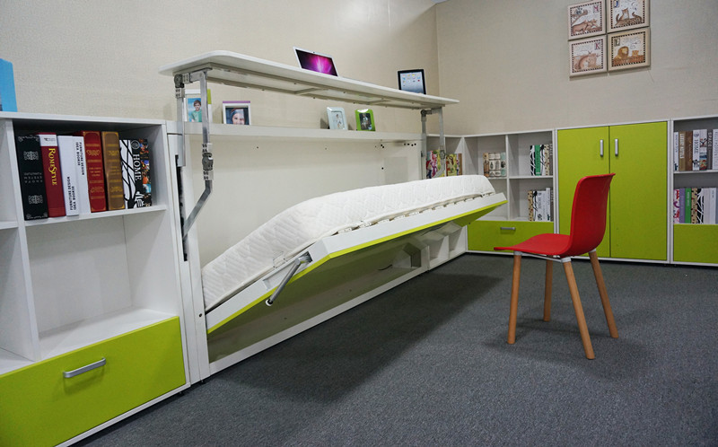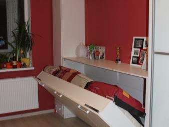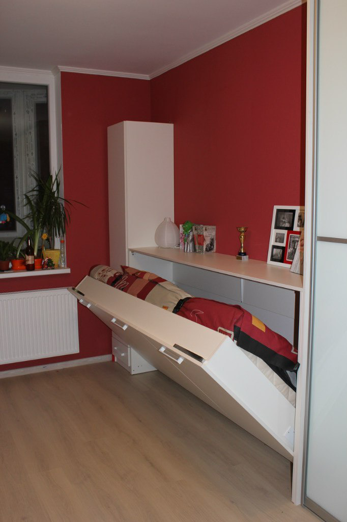 - Pliant De tels meubles peuvent également économiser de l'espace dans votre chambre. Lorsqu'il est plié, il est difficile de comprendre qu'il s'agit d'un dormeur. Extérieurement, ce meuble ne sera qu'une commode. En même temps que le matelas ne bouge pas lors du pliage du lit, il est fixé à l'aide de sangles spéciales.