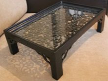 - Le matériau le plus polyvalent est le plastique, qui est léger. Il est possible de fabriquer un produit unique en plastique, en lui donnant une forme inhabituelle et en le décorant de manière pratique. Le plateau peut être décoré à votre guise à l’aide de peintures et de vernis. Le principal avantage de la table en plastique est la facilité d'entretien: il est facile à laver et à désinfecter.