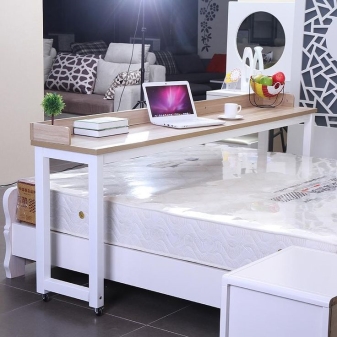La conception de la table pour le lit est très simple, elle consiste en un plateau avec des côtés et des pieds. Cependant, certains modèles ont leurs propres caractéristiques qui distinguent un produit d'un autre.