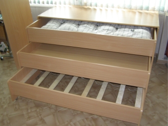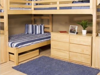 - La fonctionnalité En règle générale, les fabricants tentent de maximiser l'utilisation de tout l'espace disponible dans de telles structures de meubles. Souvent, dans le magasin, vous pouvez voir le lit avec de nombreux contenants rétractables pour stocker des vêtements, des livres ou des jouets. Souvent, le lit est associé à un bureau, une commode ou même une petite armoire.