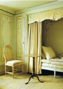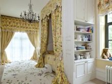 Selon le choix du tissu, il est possible de créer une ambiance différente dans la pièce. Il se transformera facilement en un boudoir, voilé par une organza irisée en mousseline de soie dense avec des ajouts en forme de lambrequins.Il est préférable de les coudre dans un velours de texture plus dense ou de velours luxueux. Une ouverture de fenêtre décorée de manière identique donnera un aspect fini à la conception.
