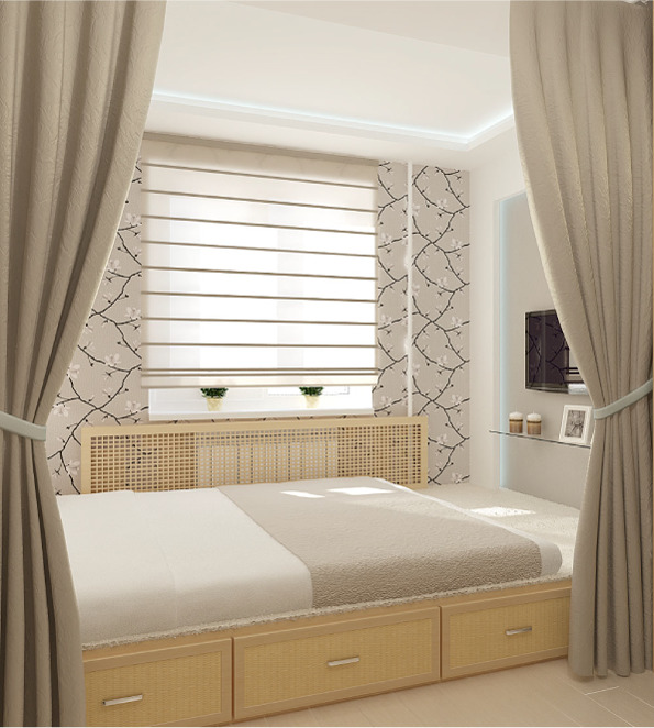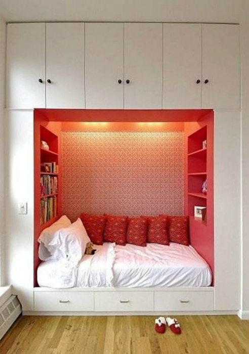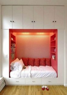 Le lit peut être situé dans une niche étroite, équipé de manière compacte pour dormir et se détendre. Après avoir réfléchi aux détails de l’emplacement des boîtes sous les étagères et au-dessus, vous allez libérer beaucoup d’espace. Utilisez les mètres carrés pensivement. Après avoir construit un créneau, vous bénéficiez de nombreux avantages: