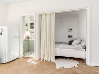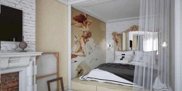 En plus de fermer une niche avec un auvent, essayez une idée avec un écran en verre dépoli, en bambou ou avec des matériaux qui correspondent au style général. Vous pouvez créer à partir de textiles non pas un rideau complet, mais un certain cadre. Donc, vous donnez la place à la concision de sommeil et de repos.