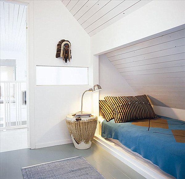 Équipez de tels endroits dans les greniers. Il y a un lit dans une niche, dans lequel elle a approfondi un regard particulièrement isolé et confortable et s’intègre parfaitement dans l’espace. Surtout quand les murs entourant le lit sont décorés dans le même ton que le reste de la zone résidentielle environnante.
